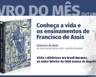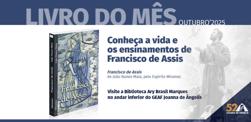 Livro do Mês – Outubro’25 Livro: Francisco de Assis Autor: João Nunes Maia Espírito: Miramar Nesta obra conhecemos mais sobre a vida de Francisco de Assis, aspectos da sua trajetória reencarnatória, com foco na ação dos espíritos na reforma íntima…